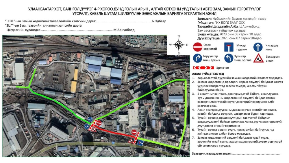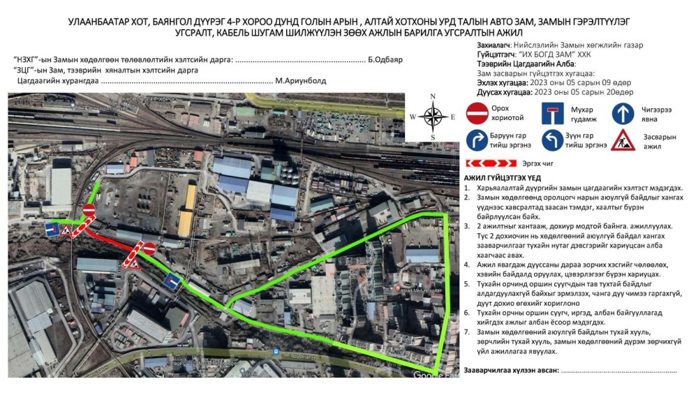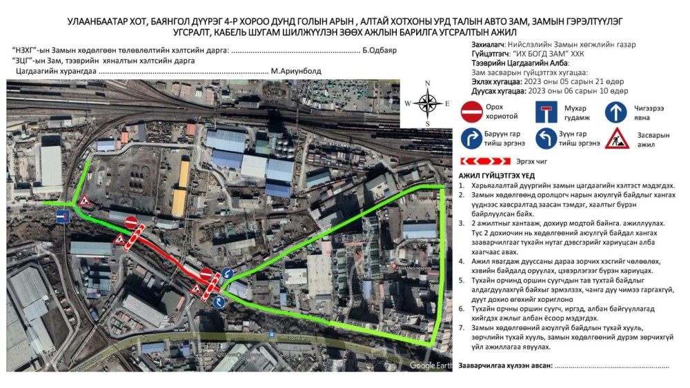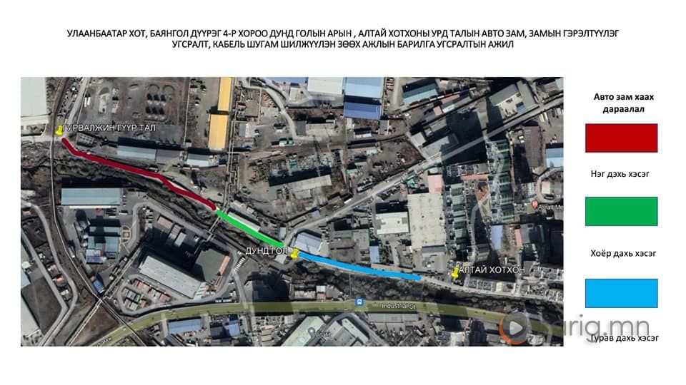Нийслэлийн Баянгол дүүрэг 4 дүгээр хорооны нутаг дэвсгэр Дунд голын арын, Алтай хотхоны урд талын авто зам, замын гэрэлтүүлэг угсралт, кабель шугам шилжүүлэн зөөх ажил хийгдэнэ.
