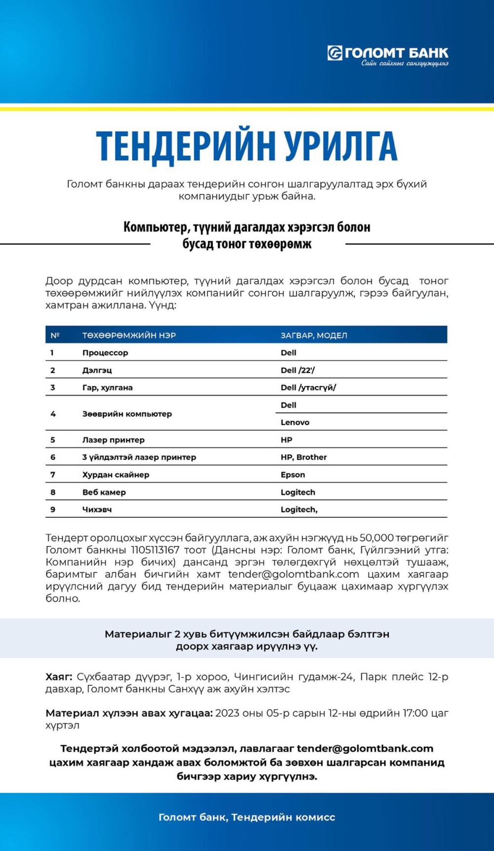 Голомт банкны дараах тендерийн сонгон шалгаруулалтад эрх бүхий компаниудыг урьж байна.