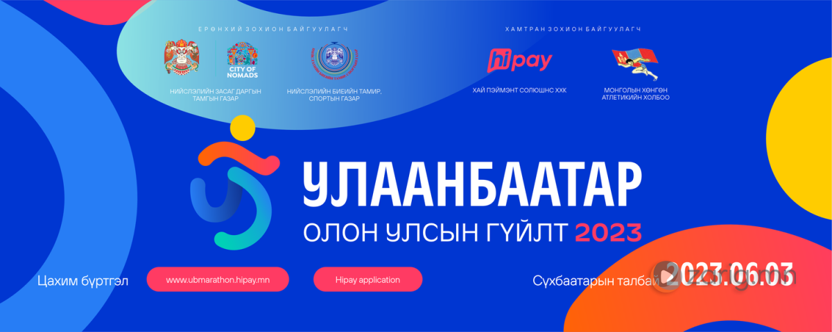 Нийслэлийн Засаг даргын захирамжаар “Улаанбаатар марафон-2023” олон улсын гүйлтийг зургаадугаар сарын 3-нд нийслэл хотноо найм дахь удаагаа зохион байгуулах гэж буй. Тус марафонд гүйх иргэдийг https://ubmarathon.hipay.mn/ цахим хуудас болон “Hipay” аппликейшнаар тавдугаар сарын 30-ныг дуустал бүртгэх юм.
