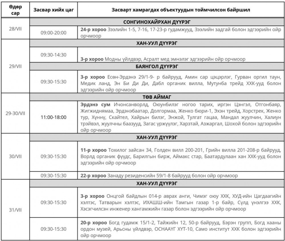 Энэ долоо хоногт буюу долдугаар сарын 28-31-нийг дуустал цахилгаан шугам сүлжээнд хийх засварын хуваарийг танилцуулж байна. Цаг агаарын нөхцөл байдлаас шалтгаалан хуваарьт өөрчлөлт орвол, гэрээт бүртгэлтэй утасны дугаарт мэдээлэл хүргэнэ.