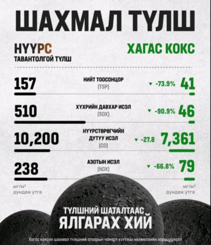 Тодруулбал, 2017 онд БНХАУ хагас коксон түлшийг нэвтрүүлж, агаарын бохирдлоо илт бууруулж чадсан. Уг хагас кокс нь өндөр дэгдэмхий хортой түүхий нүүрсийг угааж баяжуулан, 550-700 хэмд хуурай пироликын аргаар гаргаж авсан бага дэгдэмхийтэй нүүрстөрөгчийн бүтээгдэхүүн юм. Энэхүү түлшний техникийн үзүүлэлтээр агаарын бохирдол 60 хувиар буурахаар тооцоолсон байдаг байна.