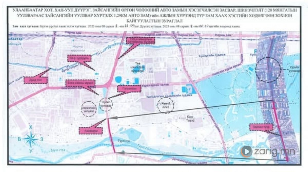 Зайсангийн өргөн чөлөөний авто замын засвар, шинэчлэлтийн ажлын хүрээнд 120 мянгатын тэмээтэй хөшөөний уулзвараас Зайсангийн гүүр хүртэлх авто замыг хэсэгчлэн хааж засвар, шинэчлэлтийн ажил хийж гүйцэтгэнэ.