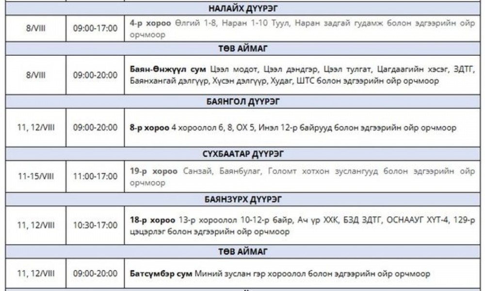 Цахилгаан шугам сүлжээнд засварын ажилтай холбоотойгоор өнөөдөр Баянгол дүүргийн 8-р хороо, Сүхбаатар дүүргийн 18-р хороо, Сүхбаатар дүүргийн 19-р хороо, Баянзүрх дүүргийн 18-р хороо болон Төв аймгийн Батсүмбэр суманд хэсэгчлэн цахилгаан хязгаарлана. Хэрэглэгчид засвар хийх хугацаанд хэрэглээгээ түр зохицуулахыг сануулж байна.