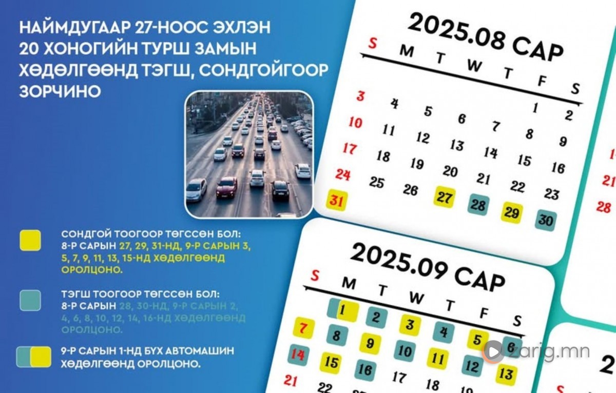 Наймдугаар сарын 27-ноос есдүгээр сарын 16-ныг дуустал тэгш, сондгой дугаарын хязгаарлалт хийхээр болсон. Дугаарын хязгаарлалт 08.00-20.00 цагийн хооронд бүсчлэл харгалзахгүй үйлчилнэ. Харин хичээлийн шинэ жилийн өдөр буюу 9-р сарын 1-нд бүх тээврийн хэрэгсэл хөдөлгөөнд оролцохоор зохицуулалт хийх юм. Сондгой тоогоор төгссөн бол наймдугаар сарын 27, 29, 31-нд, есдүгээр сарын 3, 5, 7, 9, 11, 13, 15-нд хөдөлгөөнд оролцоно. Тэгш тоогоор төгссөн бол наймдугаар сарын 28, 30-нд, есдүгээр сарын 2, 4, 6, 8, 10, 12, 14, 16-нд хөдөлгөөнд оролцоно.