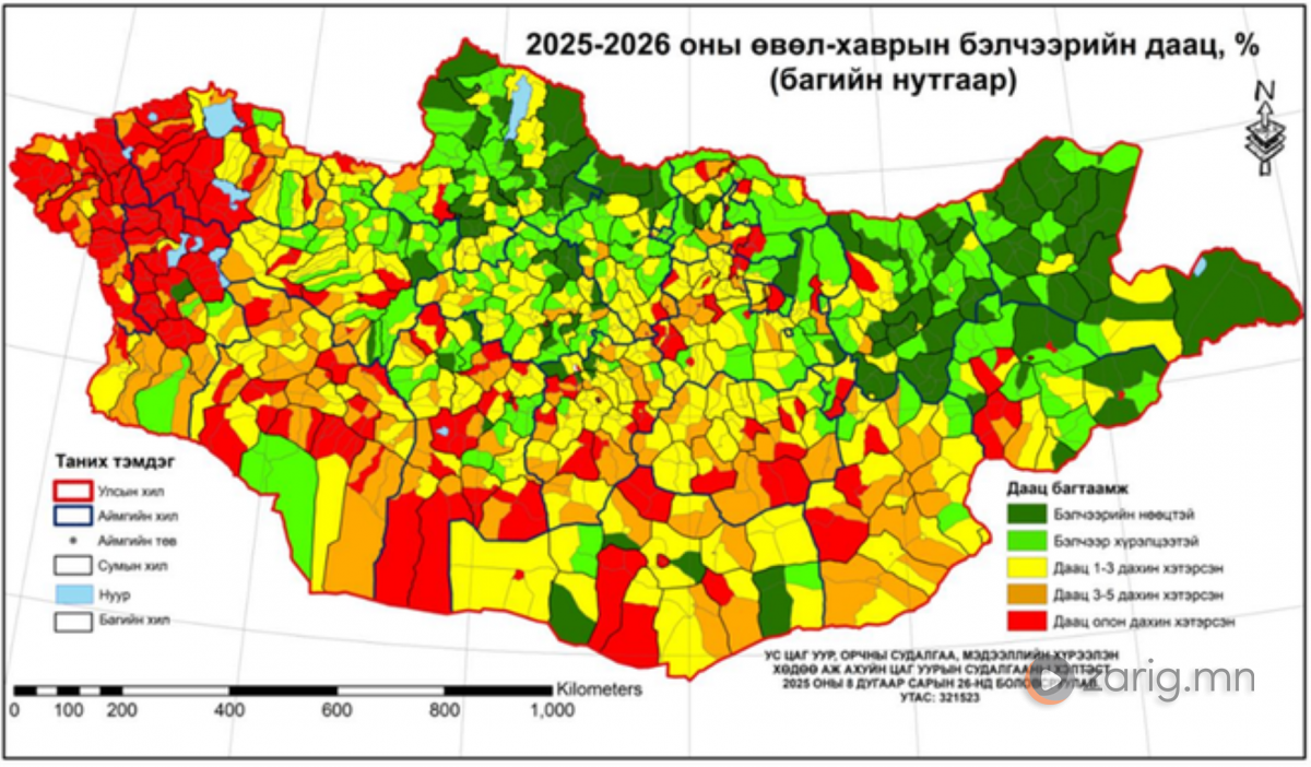 Цаг уур орчны шинжилгээний газраас 2025-2026 оны өвөл, хаврын бэлчээрийн даацыг тодорхойлон гаргажээ. Ингэхдээ баг бүрийн бэлчээрийн ургац, малын тоо, бэлчээрийн талбайн хэмжээ, бэлчээр ашиглах хугацаа зэрэг мэдээлэлд үндэслэсэн байна.