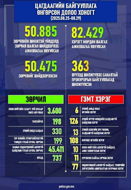 Цагдаагийн байгууллага 2025 оны эхний 7 сарын байдлаар 82.429 хэрэг бүртгэлт, мөрдөн байцаалтын хэрэгт мөрдөн шалгах ажиллагаа явуулж өнгөрсөн долоо хоногт буюу 2025 оны 08 дугаар сарын 25-ны өдрөөс 2025 оны 08 дугаар сарын 29-ний өдрүүдэд “Шүүхэд шилжүүлэх саналтай” Прокурорын байгууллагад 363 хэргийг хүргүүлсэн.