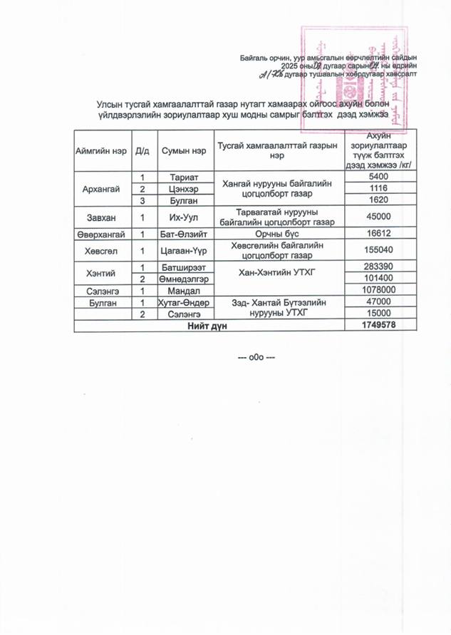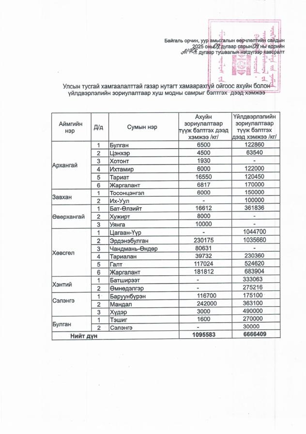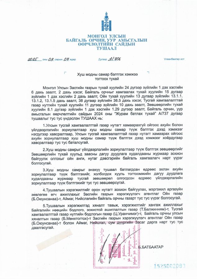 “Хуш модны самрыг БОУАӨ-ийн сайдын хуш модны самар бэлтгэх хэмжээг тогтоосон тушаал батлагдсан өдрөөс эхлэн ахуйн зориулалтаар түүж бэлтгэхийг, холбогдох хууль тогтоомжийн дагуу дуудлага худалдааны журмаар тусгай зөвшөөрөл олгогдсон өдрөөс үйлдвэрлэлийн зориулалтаар түүж бэлтгэхийг тус тус зөвшөөрсөн байна.