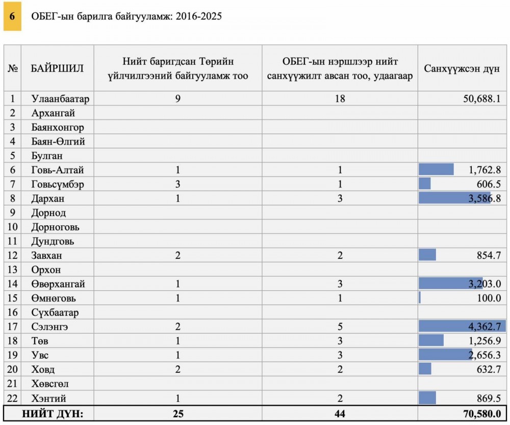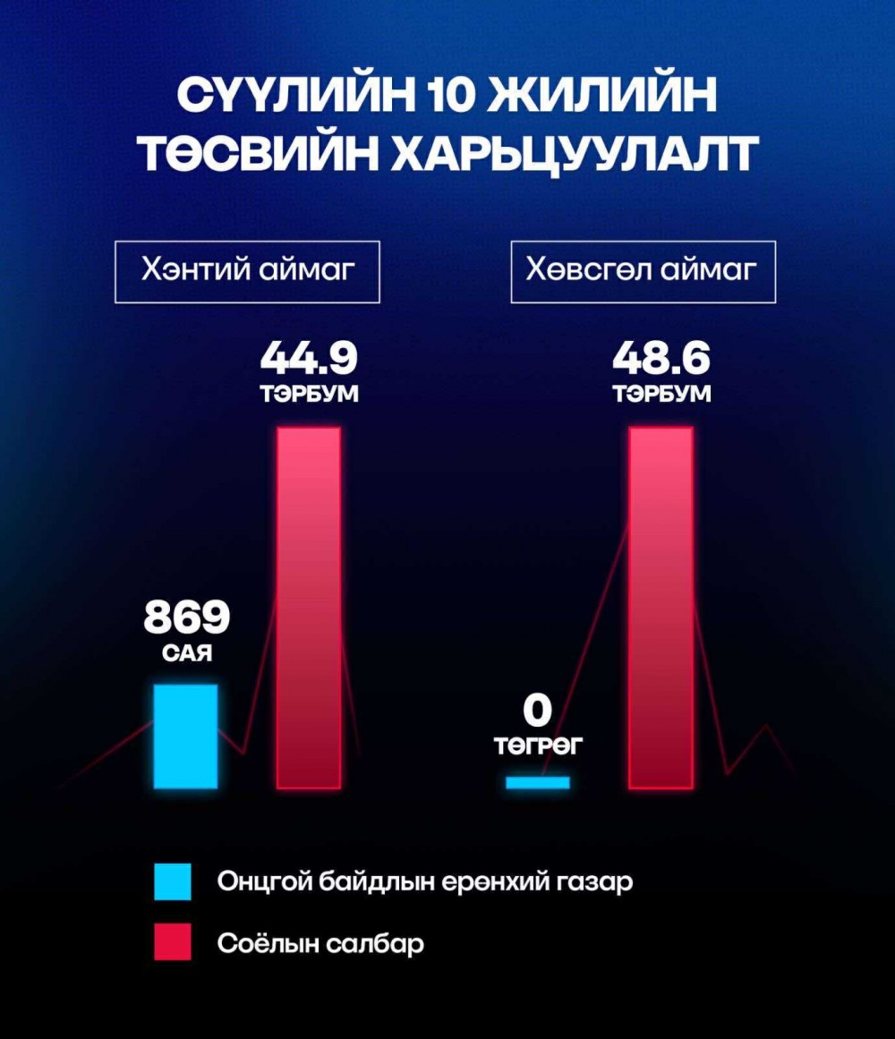Энэ утгаараа эдгээр аймгуудад Онцгой байдлынхны хангамж, нөөц, бүтэц хамгийн шаардлагатай. Гэвч жил бүр хамгийн өндөр санхүүжилт авдаг Хэнтий аймагт 10 жилийн хугацаанд ОБЕГ-ын нэршлээр хоёрхон удаагийн нийт 869 сая төгрөгийн хөрөнгө оруулалт авсан бол соёлын ордон, театр, чуулга нэршлээр нийт 35 удаагийн нийт 44,9 тэрбум төгрөгийн хөрөнгө оруулалт өгсөн байгаа юм. Үүнээс гадна Хөвсгөл аймагт энэ 10 жилийн хугацаанд онцгой байдлын салбарт нэг ч төгрөгийн хөрөнгө оруулалт оруулаагүй байж соёлын төвын урсгал зардалд 48,6 тэрбум төгрөгийн хөрөнгө оруулалт хийсэн байгааг та бүхэн доорх зурагнаас харж болно. Энэ мэт нэн шаардлагагүй төрийн өмчийн (сүртэй) барилга байгууламж баригдаж урсгал засвар, зардалд нь гарын салаагаар мөнгө урсаж байхад бодит хөгжил дэвшил, иргэдийн аюулгүй, тав тухтай амьдрах нөхцөлд ахиц дэвшил гарахгүй байна. Орон нутгийн хөгжил олон барилга байгууламж барихаас илүүтэй иргэдээ эрүүл, аюулгүй, тав тухай амьдрах нөхцөлийг бүрдүүлсэнээр бий болно” гэжээ.