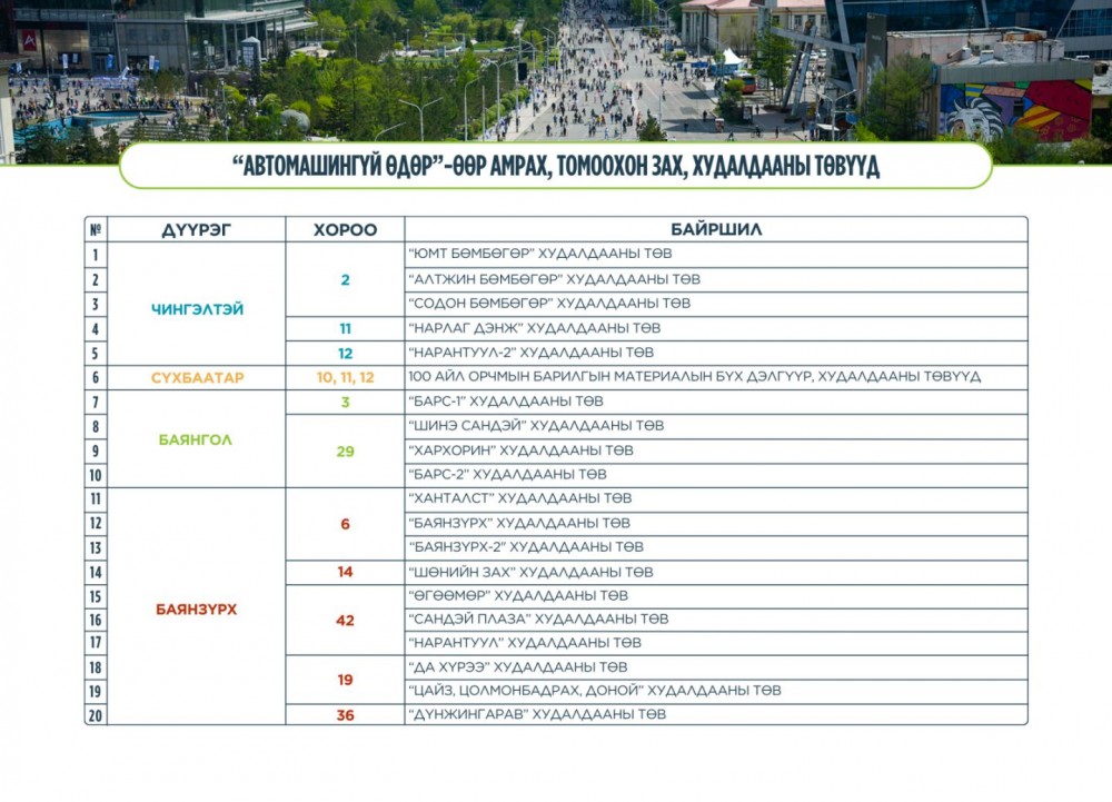 Маргааш болох "Автомашингүй өдөр"-өөр томоохон зах, худалдааны төвүүд амарна. Тодруулбал, Бөмбөгөр-1, Бөмбөгөр-2, Юмт, Содон, Алтжин бөмбөгөр, Нарантуул худалдааны төв, Дүнжингарав худалдааны төв, Өгөөмөр зах, Сандэй плаза ХТ, Шөнийн зах, Баянзүрх ХТ, Баянзүрх-2 ХТ, 100 айл орчмын барилгын материалын бүх дэлгүүр, Барс-1, 2 худалдааны төв, Хархорин, Шинэ сандэй, Ханталст, Да хүрээ зах, Цайз, Цолмонбадрах, Доной модны зах, Нарлаг дэнж, Нарантуул-2 зах ажиллахгүй.