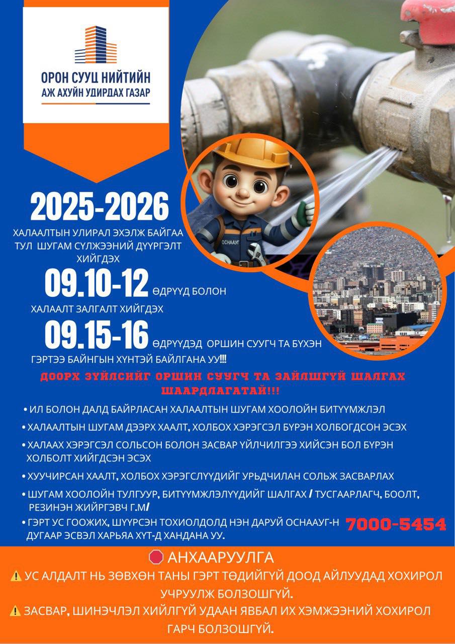 Ирэх даваа гараг буюу 9 дүгээр сарын 15-наас нийслэл хотын орон сууцны айл өрх, сургууль, цэцэрлэг, эмнэлгийн байгууллагыг халаалтын сүлжээнд залгана. Тиймээс 9 дүгээр сарын 15-16-ны өдрүүдэд оршин суугчдыг гэртээ хүнтэй байлгахыг ОСНААУГ-аас анхааруулж байна. Халаалт залгах ажил өнөөдрийг хүртэл үргэлжилж байгаа юм.