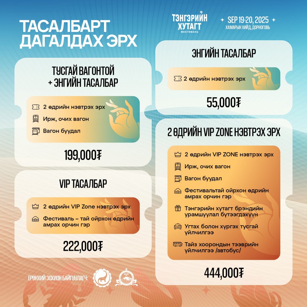 Дэлхийн энергийн төв Хамарын хийдэд энэ баасан, бямба гаригт “Тэнгэрийн хутагт” фестиваль зохиогдох нь. Тусгай вагон Улаанбаатар-Сайншанд-Улаанбаатар чиглэлд явах ба ирж очих вагоны зардал, вагондоо буудаллах эрх, 2 өдөр фестивальд оролцох тасалбар нийлээд 199 мянгаас эхэлж байна. Хувийн унаагаар очих хүмүүс 2 өдрийн тасалбараа 55 мянгаар худалдан авч оролцох юм. VIP тасалбарын сонголтууд мөн бий.