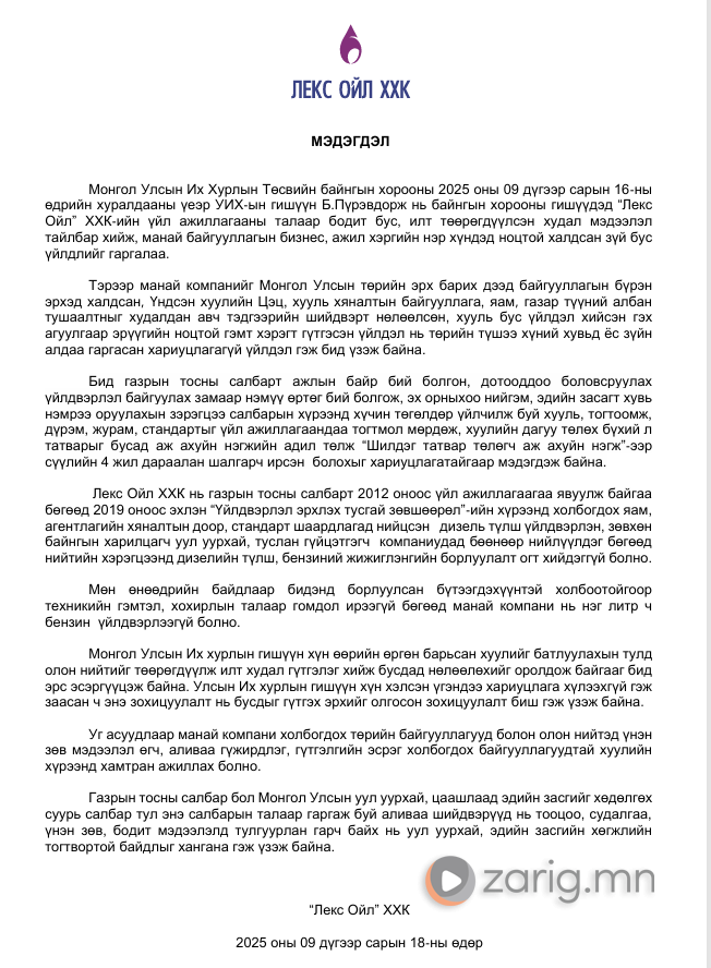 Монгол Улсын Их Хурлын Төсвийн байнгын хорооны 2025 оны 09 дүгээр сарын 16-ны өдрийн хуралдааны үеэр УИХ-ын гишүүн Б.Пүрэвдорж нь байнгын хорооны гишүүдэд “Лекс Ойл” ХХК-ийн үйл ажиллагааны талаар бодит бус, илт төөрөгдүүлсэн худал мэдээлэл тайлбар хийж, манай байгууллагын бизнес, ажил хэргийн нэр хүндэд ноцтой халдсан зүй бус үйлдлийг гаргалаа.