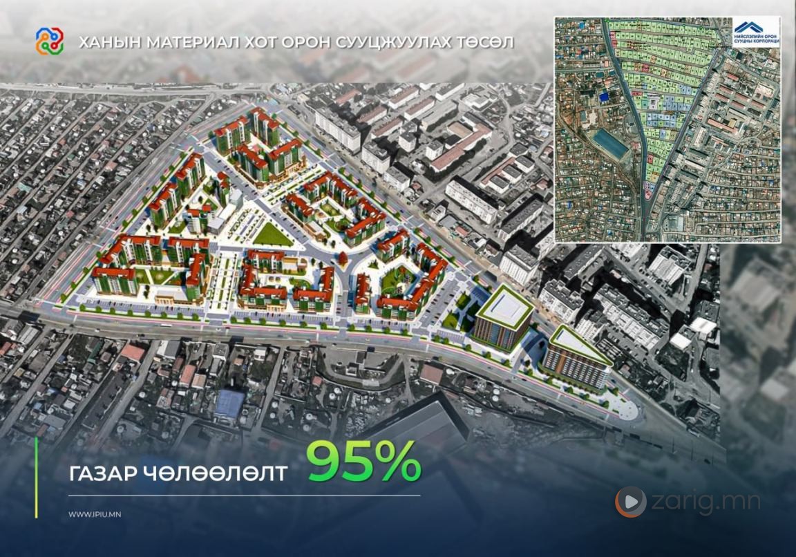 Сонгинохайрхан дүүргийн 5, 6, 7 дугаар хорооны нутаг дэвсгэрт байрлах Ханын материал орчмын гэр хорооллыг орон сууцжуулах төсөл хэрэгжиж байна. Төслийн нэгдүгээр үе шатанд 12.6 га талбайд 1800 айлын орон сууц, хоёрдугаар үе шатанд 1200 айлын орон сууцыг 8.1 га талбайд барина. Нэгдүгээр үе шатанд нийт 232 нэгж талбарыг чөлөөлөхөөс гүйцэтгэл 95 хувьд хүрээд байна.