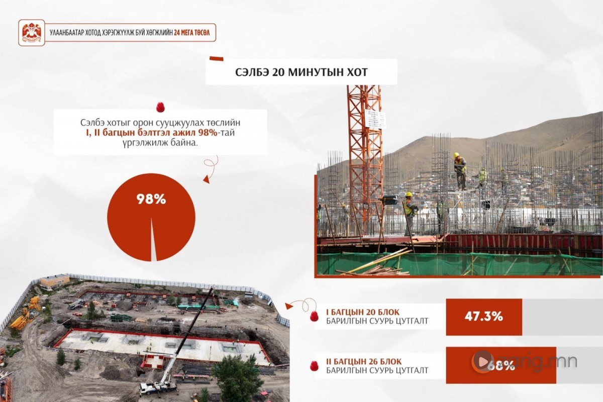 Мөн багц нэгийн 1786 айлын 20 блок орон сууцны барилгын суурь цутгалтын ажил 47.3 хувь, багц хоёрын 2028 айлын 26 блокийн суурь цутгалтын ажил 68 хувьтай тус тус үргэлжилж байна.
