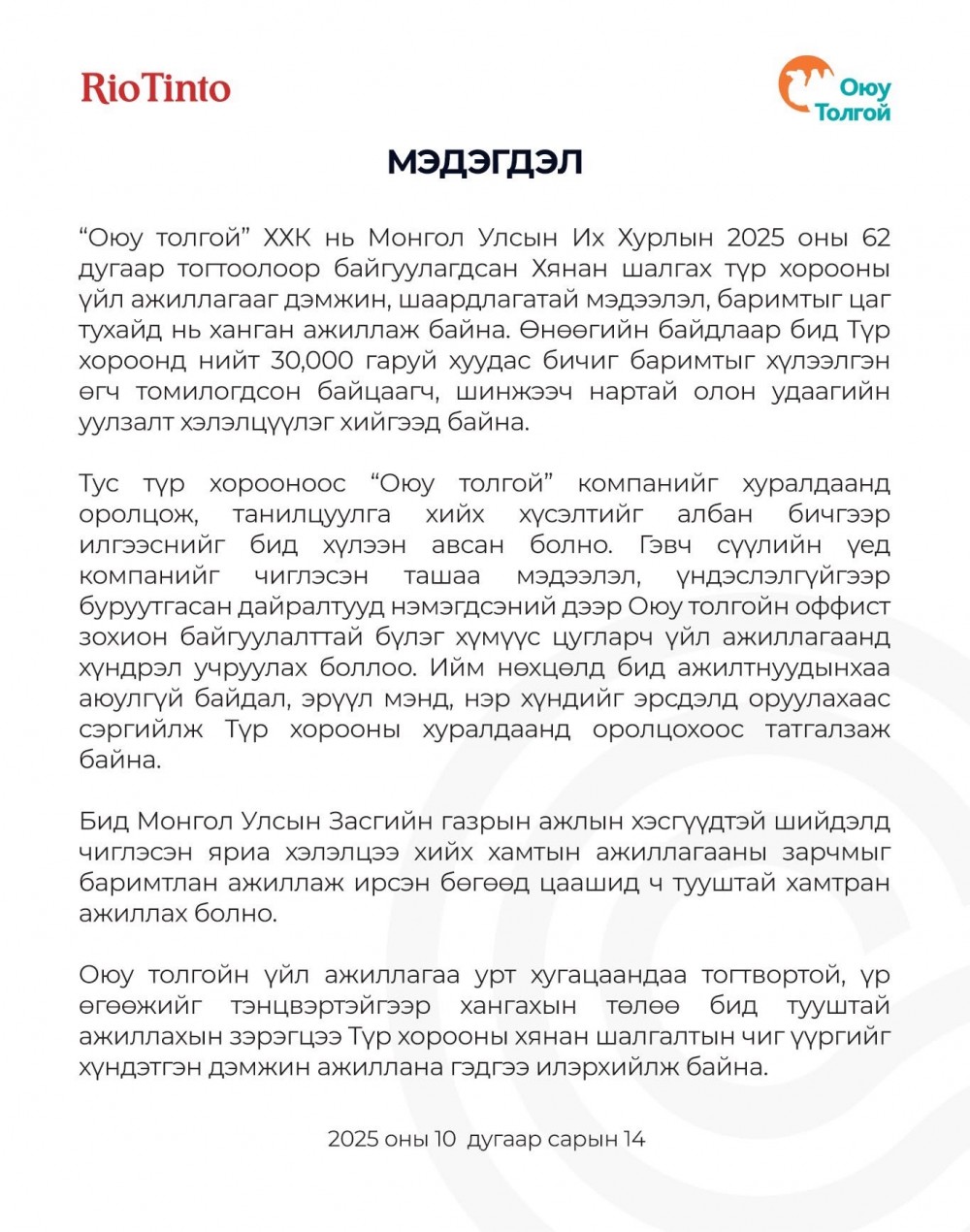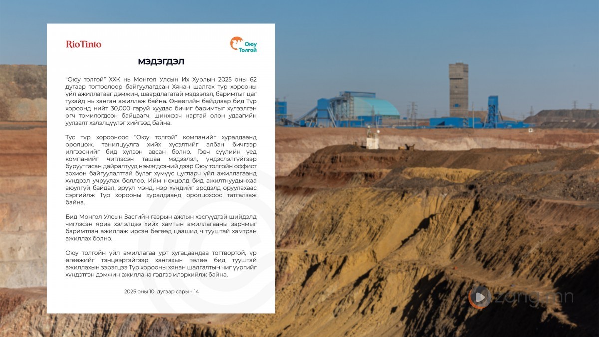 Монгол Улсын Засгийн газар “Рио Тинто”-гоос авсан зээлийн хүүг бууруулах асуудлыг шийдэхэд 78 хоногийн хугацаа үлдээд байна. УИХ-аас Оюутолгойн асуудлаар байгуулсан Хяналтын түр хорооны хурал өнөөдөр товлогдсон. Гэвч Оюу толгой ХХК-аас УИХ-аас зохион байгуулж буй түр хорооны хуралд