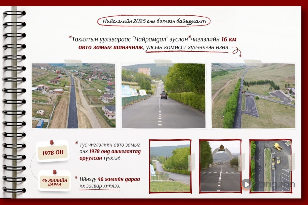 Харин энэ онд үлдсэн 12 км авто замыг шинэчилж, гэрэлтүүлэг, явган замын ажлыг дуусган улсын комисст хүлээлгэн өгөөд байна. Тахилтын уулзвараас “Найрамдал” зуслан чиглэлийн авто замыг анх 1978 онд ашиглалтад оруулсан бөгөөд 46 жилийн дараа их засвар хийлээ.