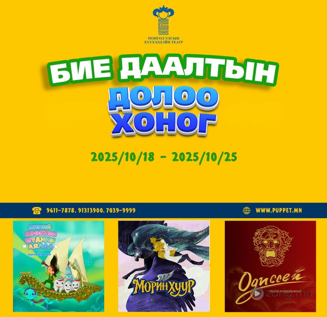 “Бие даалтын 7 хоног”-ийн хүрээнд сурагчдын сэтгэлзүйн тогтвортой байдлыг дэмжих, эерэг хандлага, бүтээлч сэтгэлгээг төлөвшүүлэх зорилгоор театрын уран бүтээлчид дараах жүжгүүдийг толилуулж байна.