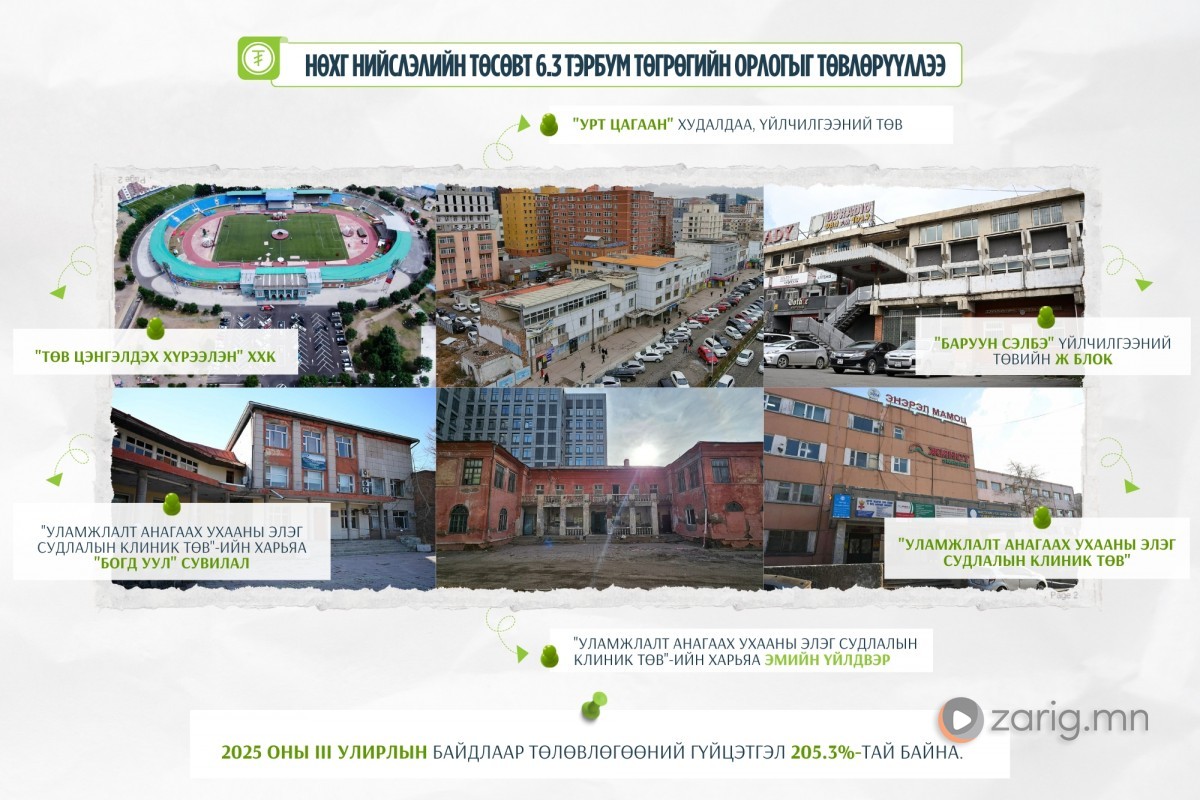 - Чингэлтэй дүүргийн тавдугаар хороонд байрлах “Баруун сэлбэ” үйлчилгээний төвийн Ж блокийн 1220 м.кв талбай бүхий барилгыг нийслэлийн өмчид авч, нээлттэй дуудлага худалдаагаар хувьчилж, 1.9 тэрбум төгрөгийн орлогыг нийслэлийн төсөвт төвлөрүүлсэн.