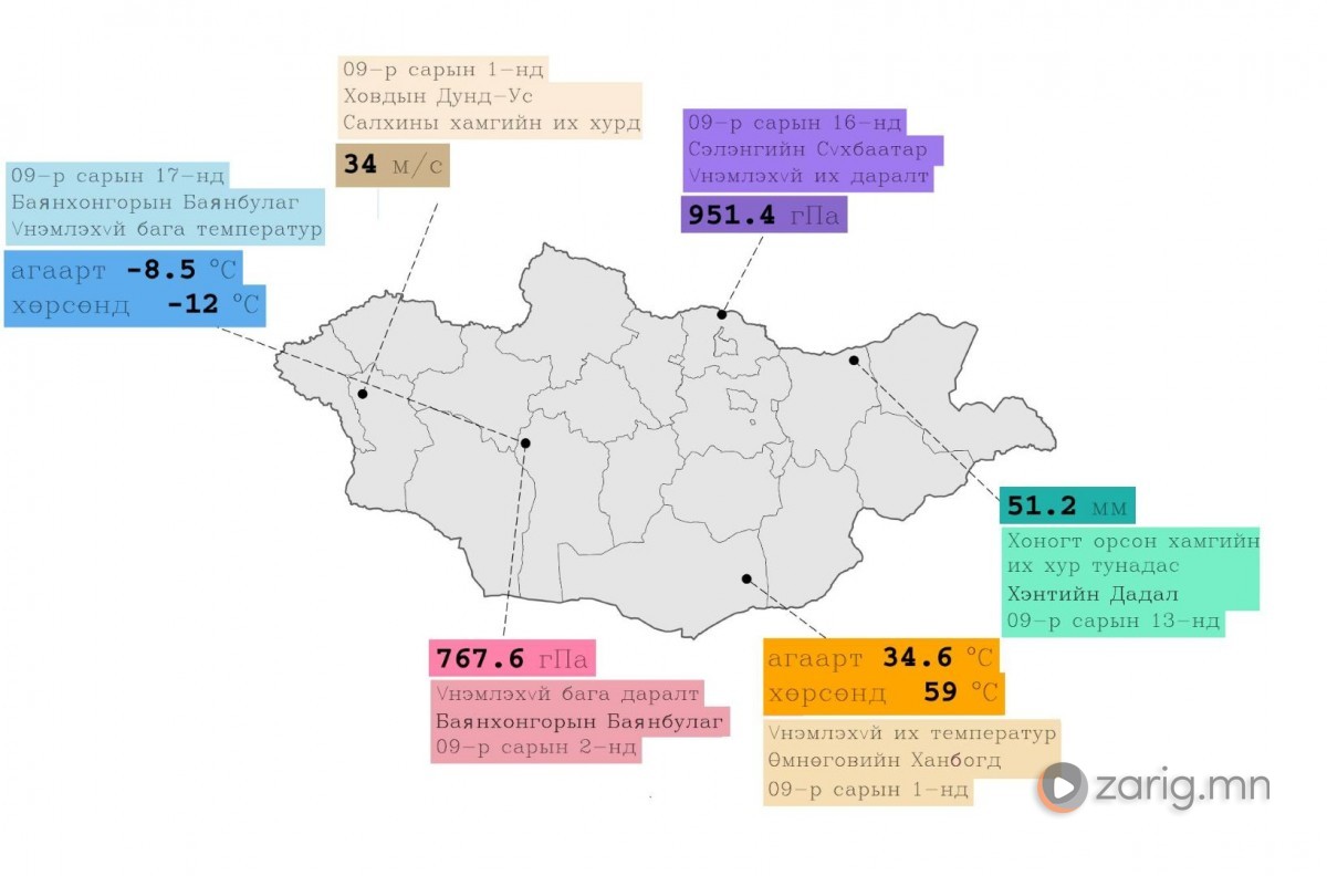 Харин агаарын температурын үнэмлэхүй их утга Өмнөговь аймгийн Ханбогд суманд 34.6°С, үнэмлэхүй бага утга Баянхонгор аймгийн Баянбулаг суманд -8.5°С хүрсэн бол хөрсний температурын үнэмлэхүй их утга Өмнөговь аймгийн Даланзадгадад 59°С, үнэмлэхүй бага утга Баянхонгор аймгийн Баянбулагт -12°С хүрч хүйтэрсэн байна.