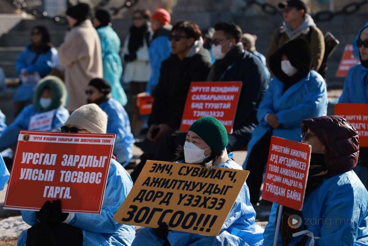 Ажил хаях талаараа мэдэгдэл хийсэн эрүүл мэндийн салбарынхны төлөөлөлтэй эрүүл мэндийн сайд Ж.Чинбүрэн гурав дахь удаагийн уулзалтаа өнөө өглөө талбай дээр хийсэн. Үргэлжүүлээд ЭМДҮЗ /Эрүүл мэндийн даатгалын Үндэсний зөвлөл/ -ийг ээлжит бусаар хуралдуулав. Яг одоо харин Эрүүл мэндийн сайдын зөвлөл хуралдаж байна. Эдгээр хуралдаанууд бүгдээрээ салбарын ажилчдын цалин хөлсийг хэрхэн нэмэгдүүлэхэд гарц хайж, нөхцөл байдлыг судалж, олон нийтэд ил болгох зорилготой юм.