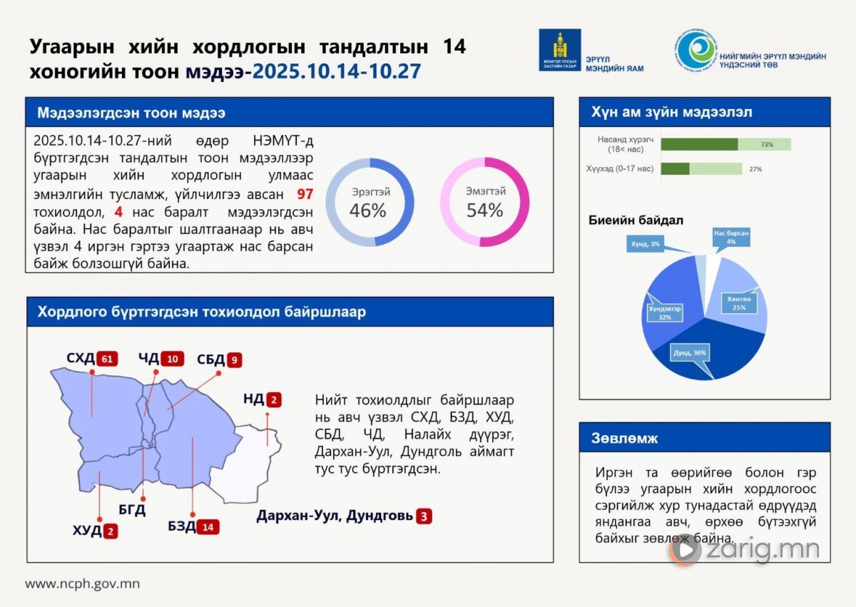 Энэ сарын 14-27-ний өдөр нийгмийн эрүүл мэндийн үндэсний төвд бүртгэгдсэн тандалтын тоон мэдээллээр угаарын хийн хордлогын улмаас эмнэлгийн тусламж, үйлчилгээ авсан 97 тохиолдол, 4 нас баралт байна. Нас баралтыг шалтгаанаар нь авч үзвэл 4 иргэн гэртээ угаартаж нас барсан байж болзошгүй байна. Нийт тохиолдлыг байршлаар нь авч үзвэл СХД, БЗД, ХУД, СБД, ЧД, Налайх дүүрэг, Дархан-Уул, Дундговь аймагт тус тус бүртгэгдсэн байна.
