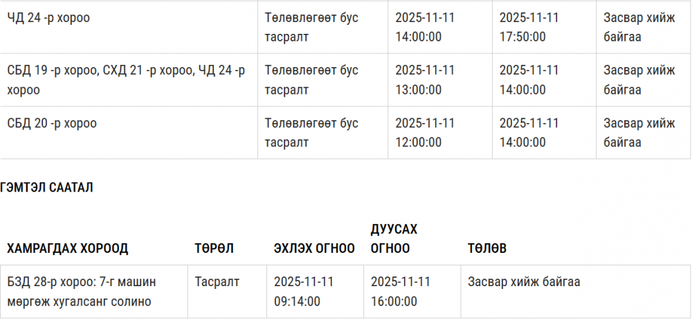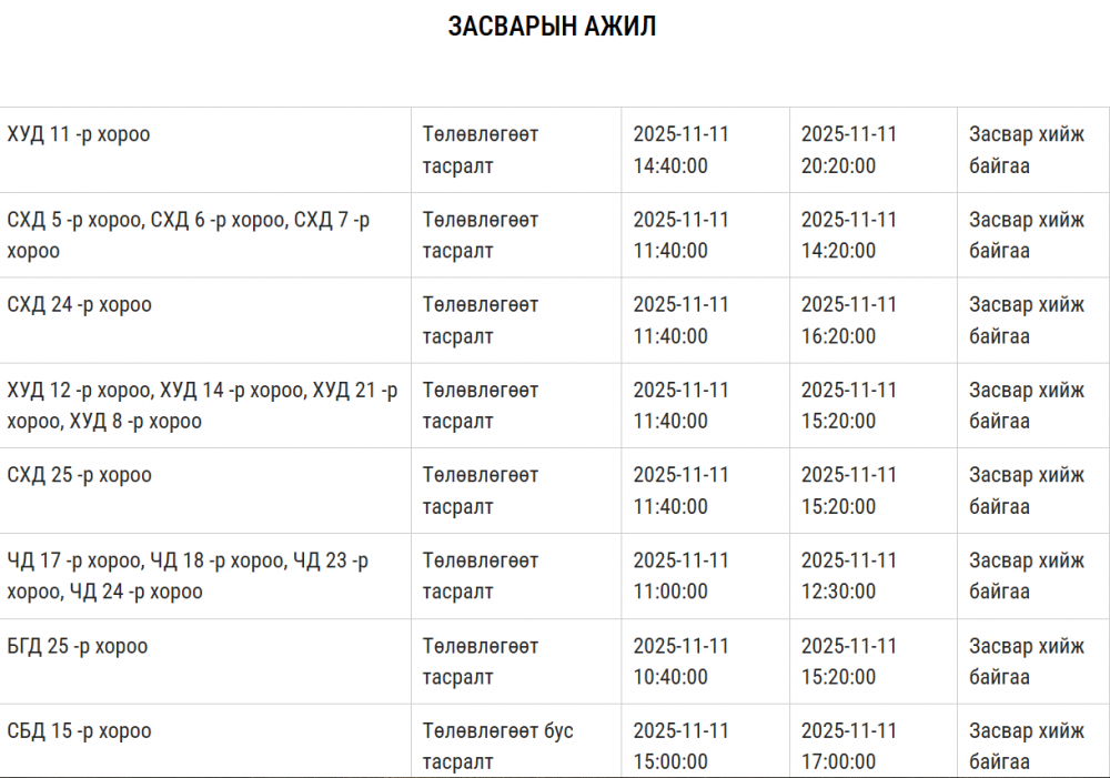 Өнөөдөр буюу 11 дүгээр сарын 11-ний өдөр цахилгаан шугам тоноглолд засвар үйлчилгээ хийх хуваарийг танилцуулж байна.