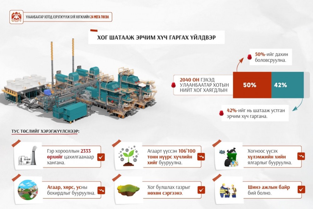 Төр, хувийн хэвшлийн түншлэлийн тухай хуулиар Монгол Улсын хэмжээнд анх удаа хэрэгжих томоохон бүтээн байгуулалтын нэг “Хог шатааж эрчим хүч гаргах үйлдвэр” барих түншлэлийн гэрээг өнгөрөгч сард байгуулсан. Төслийн гүйцэтгэгчээр Рэншоу Сычуань эрчим хүчний хөрөнгө оруулалт, байгаль орчныг хамгаалах ХХК шалгарсан юм. Өдөрт 1500 тонн хог шатаах хүчин чадалтай үйлдвэрийг Хан-Уул дүүргийн 12 дугаар хороо, Морингийн даваанд 10 га газарт барих хөрөнгө оруулалтын хэмжээ 206.5 сая ам.доллар байх бөгөөд бүтээн байгуулалтыг 30 сарын хугацаанд гүйцэтгэж, 28 жилийн дараа төрд шилжүүлнэ. Тус үйлдвэр нь жилд 8000 цаг ажиллаж, 35 МВт хүчин чадал бүхий цахилгаан эрчим хүч түгээнэ.