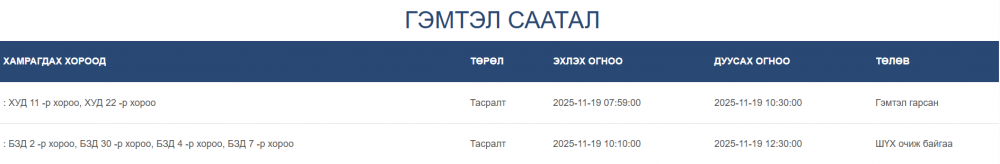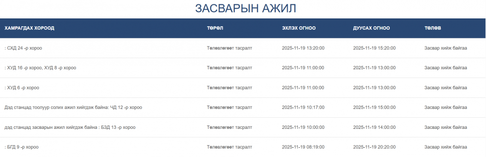 Өнөөдөр буюу 11 дүгээр сарын 19-ний өдөр цахилгаан шугам тоноглолд засвар үйлчилгээ хийх хуваарийг танилцуулж байна.