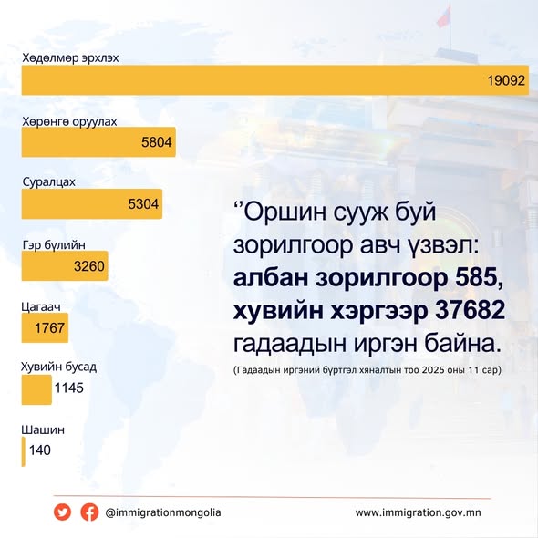 Монгол Улсад 2025 оны 11 дүгээр сарын 30-ны өдрийн байдлаар 138 улсын 37097 гадаадын иргэн албан болон хувийн хэргээр оршин суух бүртгэлтэй байна. Эдгээр иргэдийг улсаар нь авч үзвэл АНУ-ын 1175, БНСУ-ын 1777, БНЭУ-ын 2278, ОХУ-ын 3020, БНХАУ-ын 22868, иргэн, бусад улсын 5979 иргэн байна.