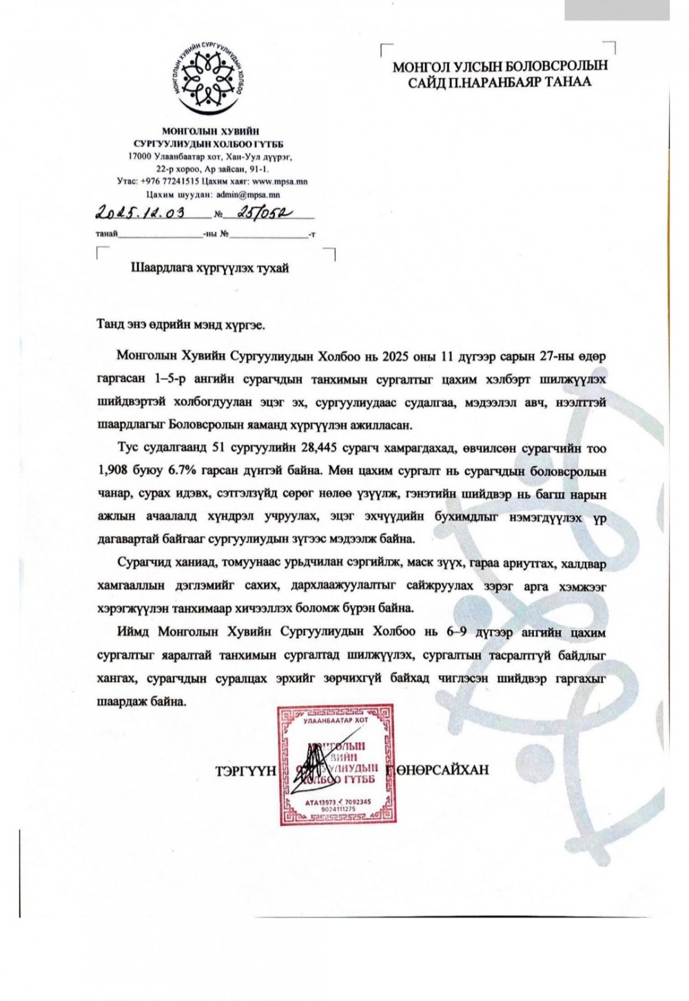 Монголын хувийн сургуулиудын холбооноос Боловсролын сайд П.Наранбаярт 6-9 дүгээр ангийн хүүхдүүдийг танхимаар хичээллүүлэх тухай шаардлага хүргүүлcэн байна. Тус шаардлагад "Монголын Хувийн Сургуулиудын Холбоо нь 2025 оны 11 дүгээр сарын 27-ны өдөр гаргасан 1-5-р ангийн сурагчдын танхимын сургалтыг цахим хэлбэрт шилжүүлэх шийдвэртэй холбогдуулан эцэг эх, сургуулиудаас судалгаа, мэдээлэл авч, нээлттэй шаардлагыг Боловсролын яаманд хүргүүлэн ажилласан.