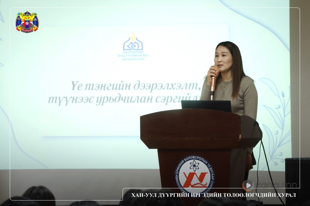2025 оны 3 дугаар сарын 24-ний өдөр ЕБ-ын 15, 32, 75 дугаар сургуулиудын ахлах ангийн 300 гаруй сурагчдад Хан-Уул дүүргийн иргэдийн Төлөөлөгчдийн Хурлын Гэмт хэргээс урьдчилан сэргийлэх ажлыг зохицуулах салбар зөвлөл, Цагдаагийн газар, Хүүхэд, гэр бүлийн хөгжил, хамгааллын хэлтэстэй хамтран цахим гэмт хэрэг, хорт зуршлуудын хор уршиг, үе тэнгийн дээрэлхэлт, гэмт хэргээс өөрийгөө болон бусдыг хэрхэн хамгаалах талаар зөвлөмж, мэдээллийг өгч, асуусан асуултад хариулан чөлөөт ярилцлага хийлээ.