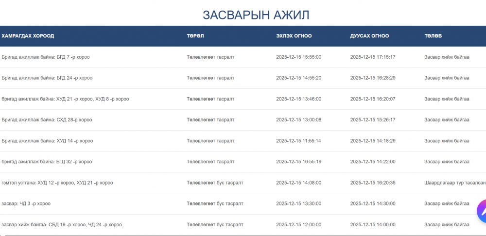 Өнөөдөр буюу 12 дүгээр сарын 15-ний өдөр цахилгаан шугам тоноглолд засвар үйлчилгээ хийх хуваарийг танилцуулж байна.