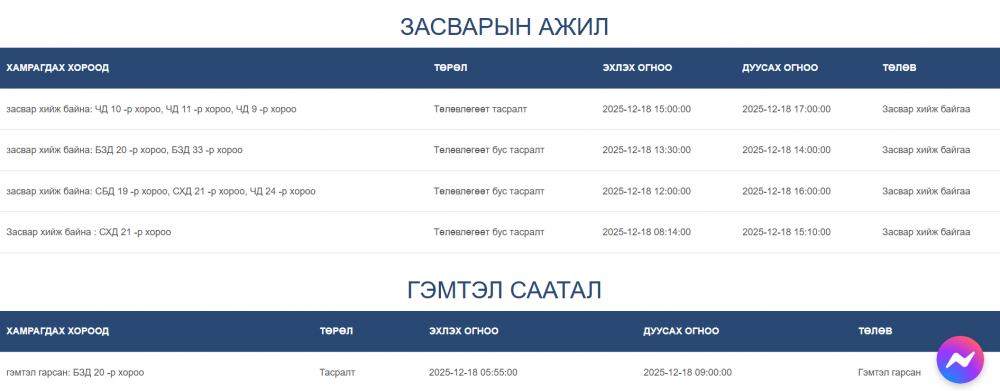 Өнөөдөр буюу 12 дүгээр сарын 18-ний өдөр цахилгаан шугам тоноглолд засвар үйлчилгээ хийх хуваарийг танилцуулж байна