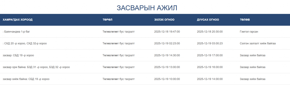 Улаанбаатар цахилгаан түгээх станц ТӨХК өнөөдөр /2025.12.19/-нд цахилгаан хязгаарлах байршлуудыг танилцууллаа.