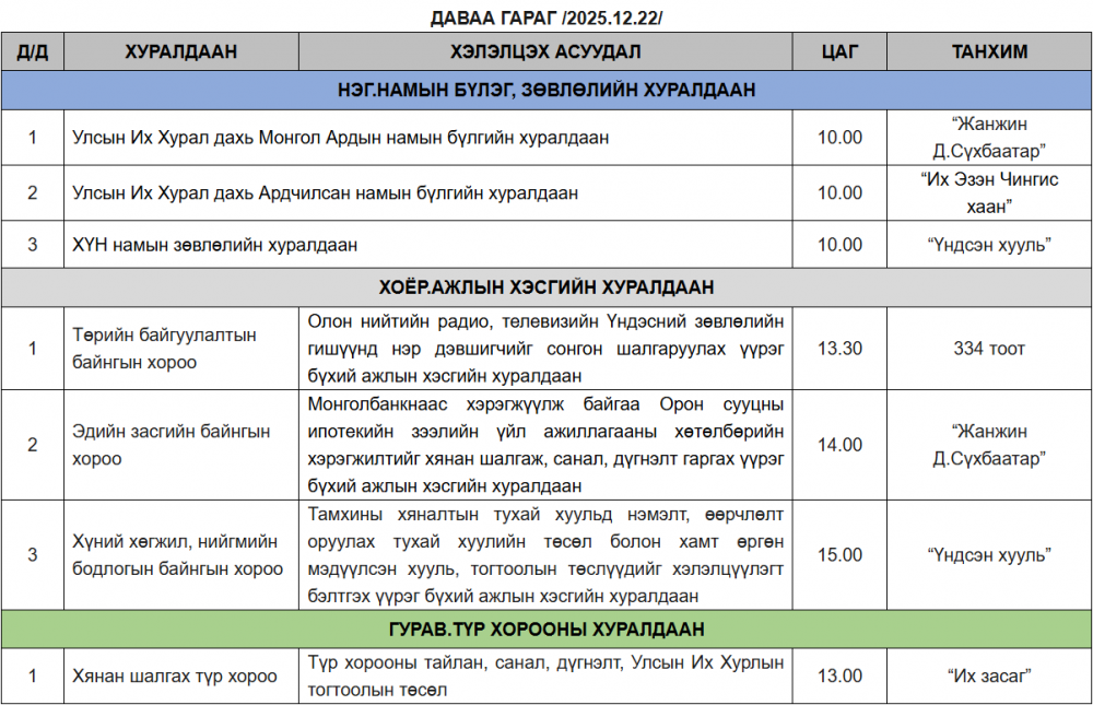 Улсын Их Хурлын 2025 оны намрын ээлжит чуулганы 2025 оны 12 дугаар сарын 22-ны өдрийн хуралдаанаар хэлэлцэх асуудлын тов, дараалалалд Монголбанкнаас хэрэгжүүлж байгаа Орон сууцны ипотекийн зээлийн үйл ажиллагааны хөтөлбөрийн хэрэгжилтийг хянан шалгаж, санал, дүгнэлт гаргах үүрэг бүхий ажлын хэсгийн хуралдаан ирэх даваа гаригт болохоор товлогджээ.