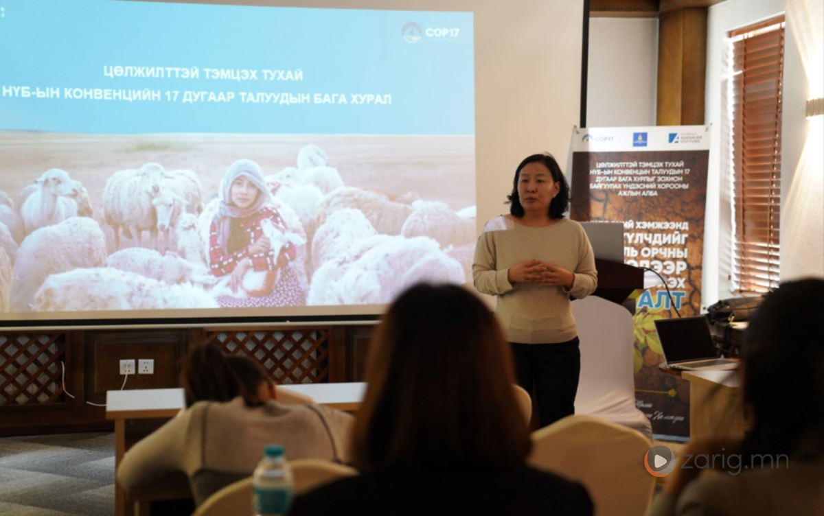 Дэлхийн хэмжээний томоохон хурал Монголд анх удаа болох гэж буйтай холбоотойгоор БОУАӨЯ, Цөлжилттэй тэмцэх тухай НҮБ-ын Конвенцын Талуудын 17 дугаар бага хурлыг зохион байгуулах Үндэсний хорооны Ажлын алба “Конрад-Аденауэр сан”-тай хамтран “Үндэсний хэмжээнд сэтгүүлчдийг байгаль орчны чиглэлээр мэргэшүүлэх сургалт”-ын хоёр дахь шатны сургалтыг арваннэгдүгээр сарын 13-14-ий өдрүүдэд зохион байгууллаа.