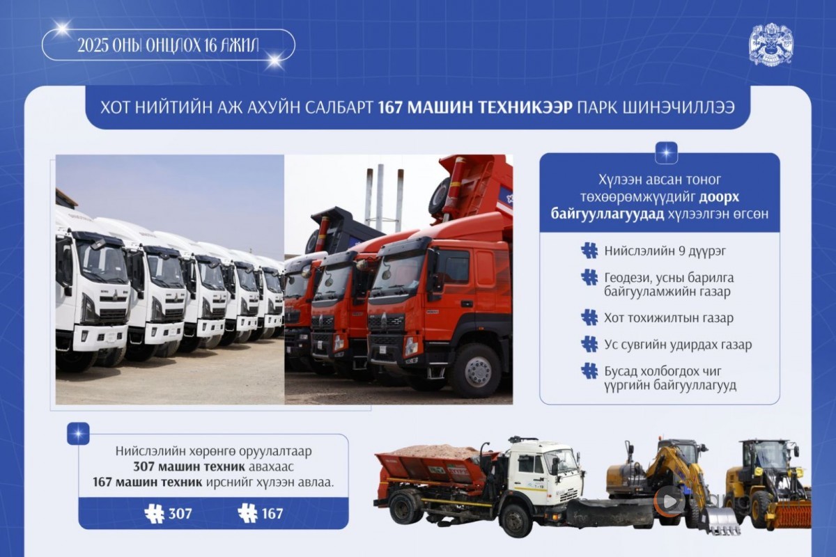 Энэ онд Улаанбаатар хотын цэвэр цэмцгэр, ая тухтай орчныг бүрдүүлэх, иргэдийн эрүүл, аюулгүй орчинд амьдрах нөхцөлийг бий болгох зорилгоор хот, нийтийн аж ахуйн салбарт парк шинэчлэлийн ажлыг үе шаттай хийжээ. 2025 онд нийслэлийн хөрөнгө оруулалтаар 307 ширхэг машин техник авахаас 167 машин техник ирснийг хүлээн авжээ. Дээрх хүлээн авсан тоног төхөөрөмжүүдийг нийслэлийн есөн дүүрэг, Геодези, усны барилга байгууламжийн газар, Хот тохижилтын газар, Ус сувгийн удирдах газар болон холбогдох чиг үүргийн байгууллагуудад хүлээлгэн өгч, хотын аж ахуйн ажилд ашиглаж байна. Үүнээс дүүргүүдэд 124, харьяа газруудад 43 машин техникийг хуваарилжээ. Эдгээр машин техникийг таван жилийн хугацаатай, урьдчилгаагүй, хүүгүй лизингээр гүйцэтгэгч байгууллагуудад гэрээлж өгснөөр санхүүгийн хүндрэлгүйгээр парк шинэчлэлээ хийх, цаашлаад сар бүрийн ашиглалтын төлбөрөөс сан үүсгэж парк шинэчлэлийг тогтмол тасралтгүй хийх боломжийг бүрдүүлээд байна.