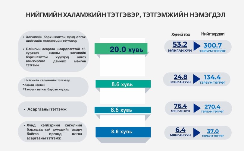 65 насанд хүрсэн иргэн, тэжээгч нь нас барсан 18 хүртэлх насны хүүхэд, 18 хүртэлх насны 4 ба түүнээс дээш хүүхэдтэй өрх толгойлсон эх, эцэгт олгох нийгмийн халамжийн бусад тэтгэврийн хэмжээг 432,000 төгрөгөөр тогтоолоо.