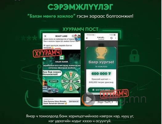 Иймд иргэд Та бүхэн цахим залиланд өртөхөөс сэргийлж сошиал платформ буюу фейсбүүк, инстаграм болон телеграмд байрлаж буй баталгаагүй линк, холбоос дээр дарахгүй байх, банкны нууц үг, картын дугаар, CVV кодоо бусдад өгөхгүй байх, энэ төрлийн зар мэдээлэлд хууртахгүй байхыг цагдаагийн байгууллагаас сэрэмжлүүлж байна