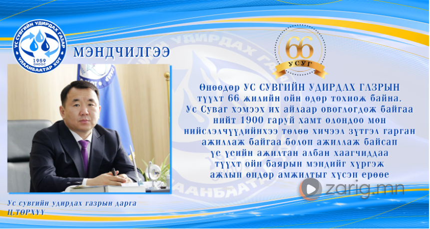 Ус Суваг хэмээх их айлаар овоглогдож байгаа нийт 1900 гаруй хамт олондоо, мөн нийслэлчүүдийнхээ төлөө хичээл зүтгэл гарган ажиллаж байгаа болон ажиллаж байсан үе үеийн ажилтан албан хаагчиддаа түүхт ойн баярын мэндийг хүргэж ажлын өндөр амжилтыг хүсэн ерөөе