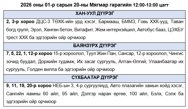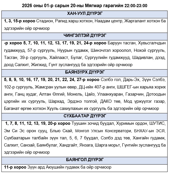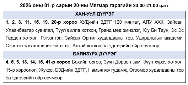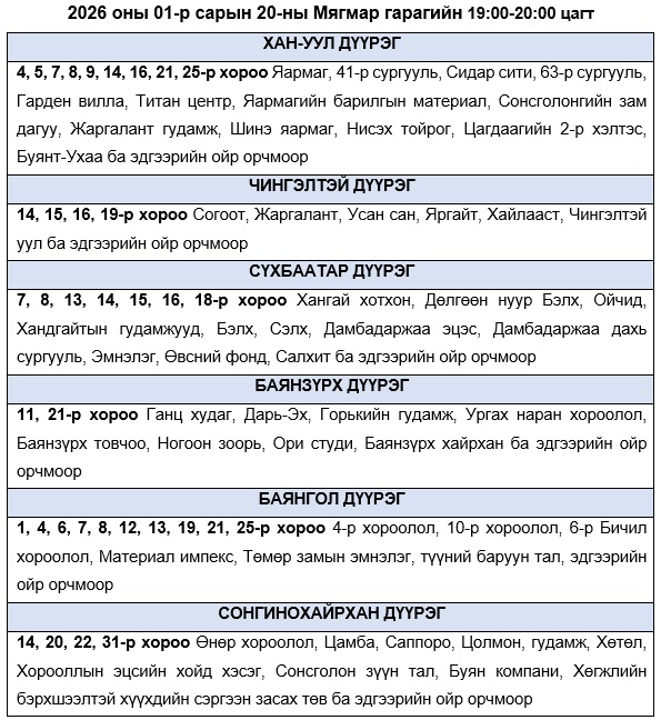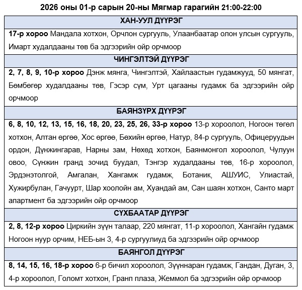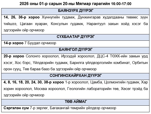 Эрчим хүчний системийн ТАСРАЛТГҮЙ, НАЙДВАРТАЙ байдлыг хангахын тулд дараах цагуудад зайлшгүй шаардлагатай бус цахилгаан хэрэгслүүдээ унтрааж, ТОГ-оо тохируулахыг иргэд, аж ахуйн нэгжүүдэд уриалж байна.