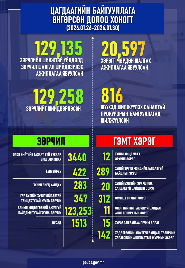 Цагдаагийн байгууллагаас өнгөрсөн 7 хоногт 20,597 хэрэгт мөрдөн шалгах ажиллагааг явуулж, өнгөрсөн долоо хоногт (2026.01.26-аас 2026 оны 01 дүгээр сарын 30-ны өдрүүдэд) 816 хэргийг шүүхэд шилжүүлэх саналтай прокурорын байгууллагад хүргүүлсэн байна.