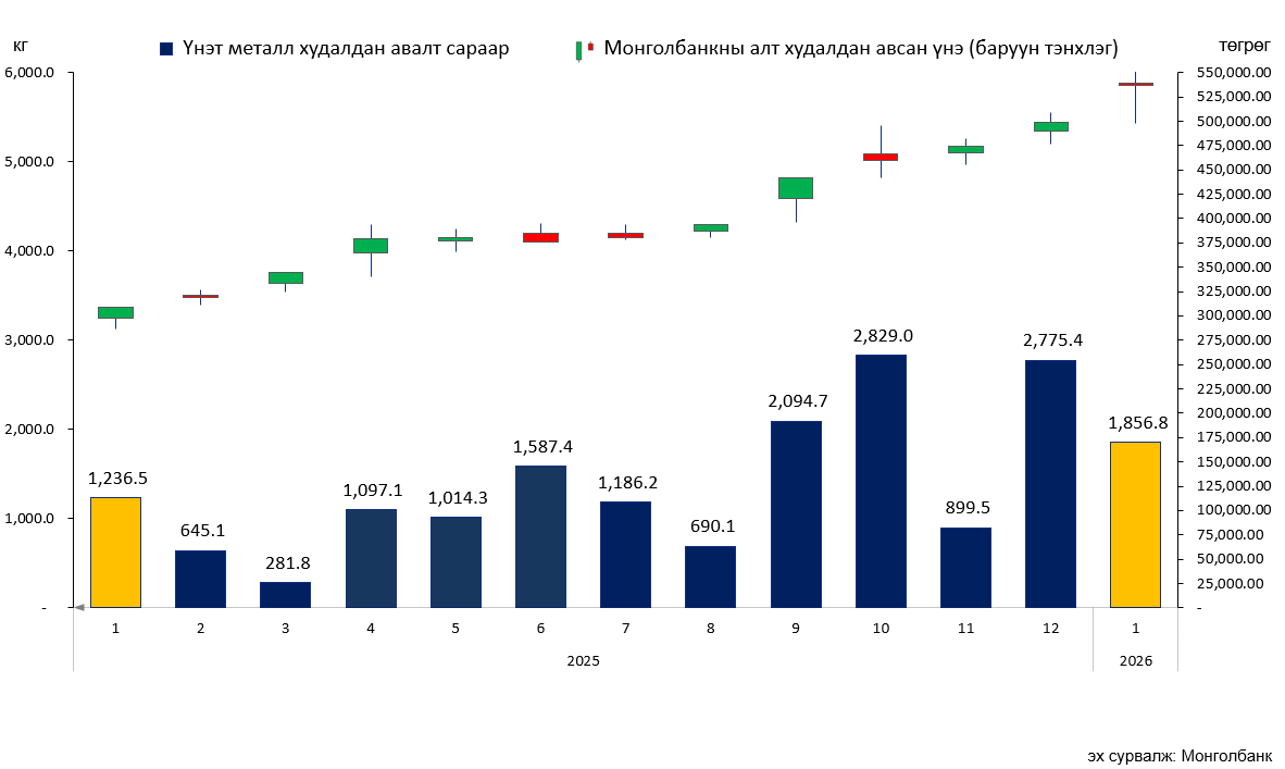 Монголбанк 2026 оны 1 дүгээр сард 1.9 тонн үнэт металл, үүнээс Дархан-Уул аймаг дахь Монголбанкны салбар 61.0 кг, Баянхонгор аймаг дахь Монголбанкны салбар 456.9 кг үнэт металл худалдан авсан байна. Энэ нь өмнөх оны мөн үетэй харьцуулбал 50.2 хувиар өссөн үзүүлэлт байна.