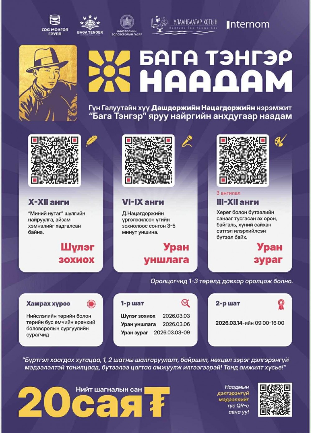 Уран зураг (III–XII анги, насны 3 ангиллаар) оролцох бөгөөд шагналын сан 20 сая төгрөг юм. Энэхүү наадам нь Монголын хүүхэд залуучуудад өв соёлыг таниулах, түгээн дэлгэрүүлэх, өвлүүлэн үлдээх зорилготойгоор жил бүр уламжлал болгон зохион байгуулагдах юм.