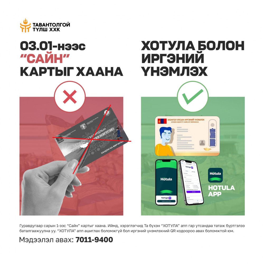 Нийслэлийн хэмжээнд сайжруулсан шахмал түлшний борлуулалтын ил тод байдал, хяналтын тогтолцоог сайжруулах хүрээнд 2026 оны 03 дугаар сарын 01-ний өдрөөс эхлэн “Сайн” карт ашиглахыг бүрэн зогсоож, түлш худалдан авахад зөвхөн ХОТУЛА аппликэйшн болон иргэний үнэмлэх ашиглахаар боллоо.