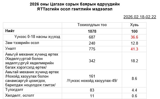 Цагаан сарын баярын өдрүүдэд Гэмтэл Согог Судлалын Үндэсний Төв-ийн Яаралтай тусламжийн тасагт нийт 1878 хүн осол, гэмтлийн шалтгаанаар ханджээ. Тус мэдээлэл нь хоёрдугаар сарын 18-22-ны өдрүүдэд бүртгэгдсэн үзүүлэлт юм. Нийт тохиолдлын 36.6 хувь буюу 687 нь 0–18 насны хүүхдүүд байгаа бол уналт хамгийн өндөр хувийг эзэлсэн байна.