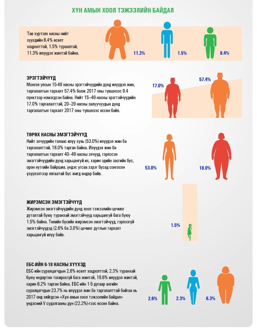 • 15–49 насны эрэгтэйчүүдийн 57.4% нь илүүдэл жин, таргалалттай