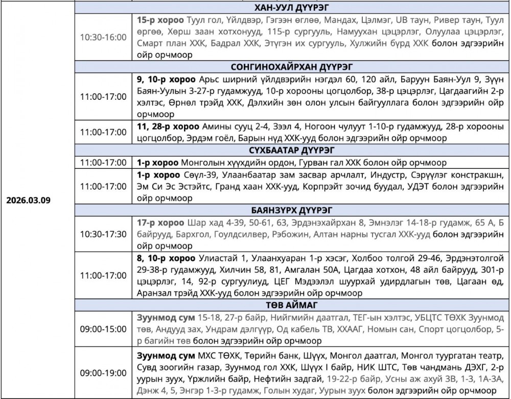 Улаанбаатар Цахилгаан Түгээх Сүлжээ(УБЦТС) ТӨХК гуравдугаар сард цахилгаан шугам тоноглолд засвар хийх тоймчилсон байршил, цагийн хуваарийг гаргасан. Тэгвэл уг хуваарийн дагуу өнөөдөр цахилгаан хязгаарлах байршлуудыг танилцуулж байна