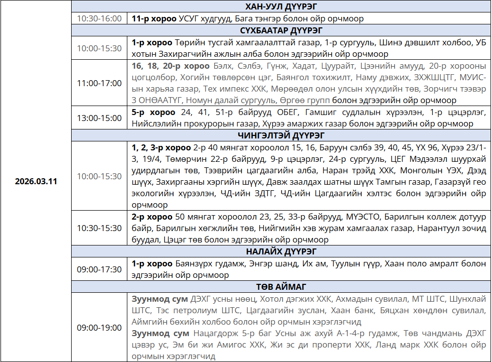 Жич: Засварын ажлыг тухайн тоноглолыг хүчдэлээс бүрэн чөлөөлсний дараа хийдэг ажлын нөхцөлийг ойлгож, хүлээцтэй хандахыг хүсье. Цаг агаарын байдлаас шалтгаалан хуваарьт өөрчлөлт орох тохиолдолд гэрээнд бүртгэгдсэн утасны дугаарт мэдээллийг хүргэх болно.