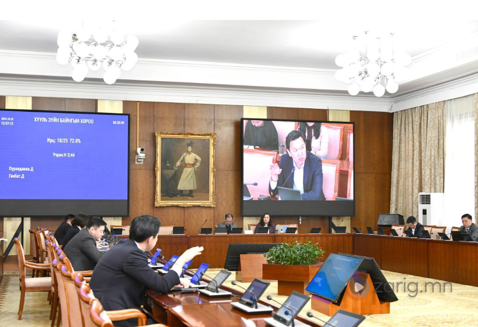 Улсын Их Хурлын Хууль зүйн байнгын хорооны өнөөдрийн (2025.10.23) хуралдаан 12 цаг 26 минутад гишүүдийн 56 хувийн ирцтэй эхэлж, хоёр асуудал хэлэлцэв.